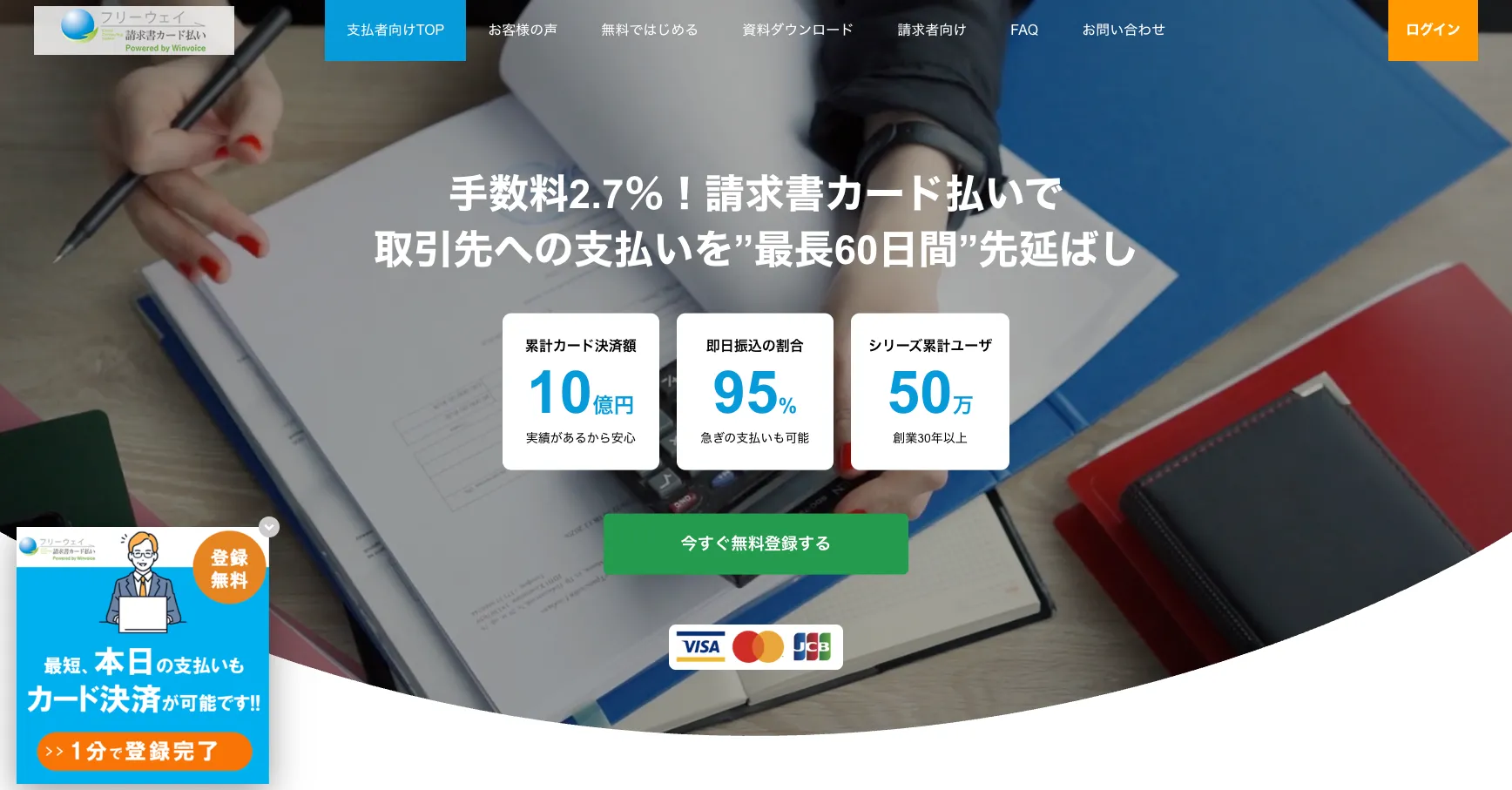 フリーウェイ請求書カード払いは、手数料率2.7%(非課税)と業界最安クラスのコストで利用できるサービスです。