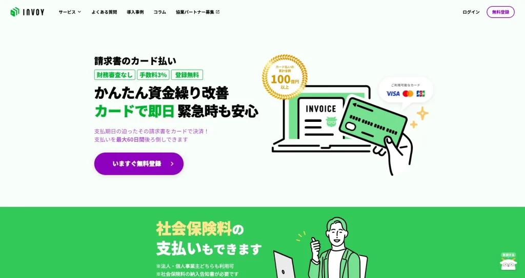 INVOYカード払い![]() 詳細を見る | 3% 非課税 | (VISA) (Mastercard) (JCB) | 法人・個人事業主 対応スピード 3営業日以内 100万円利用の手数料 30,000円(非課税) |