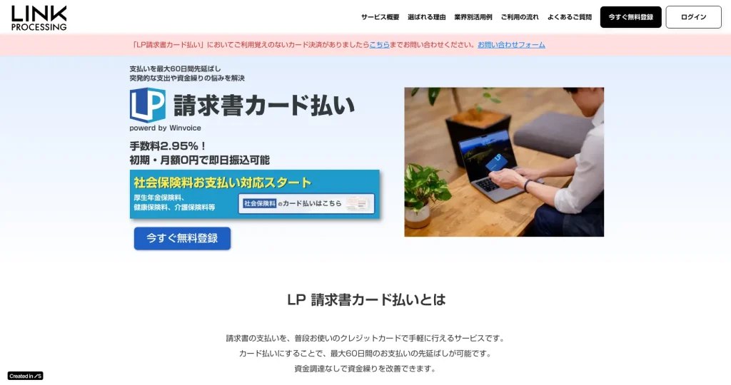 LP請求書カード払い![]() 詳細を見る | 2.95% 非課税 | (VISA) (Mastercard) (JCB) | 法人・個人事業主 対応スピード 最短即日〜5営業日以内 100万円利用の手数料 29,500円(非課税) |