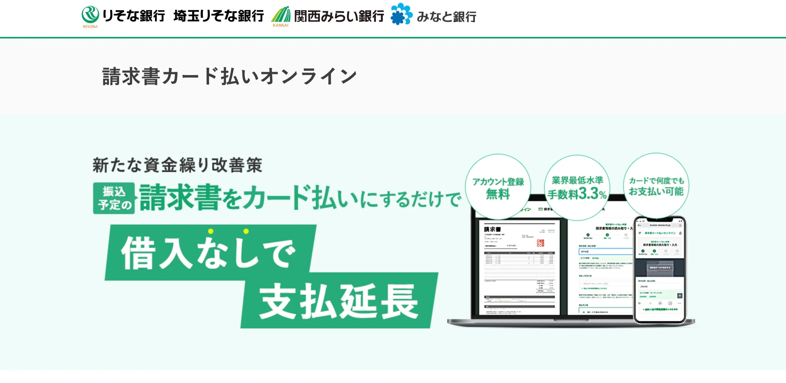 りそな銀行 請求書カード払いオンライン![]() 詳細を見る | 3.3% | (VISA) (JCB) | 法人・個人事業主 対応スピード 3営業日以降 100万円利用の手数料 36,300円(税込) |