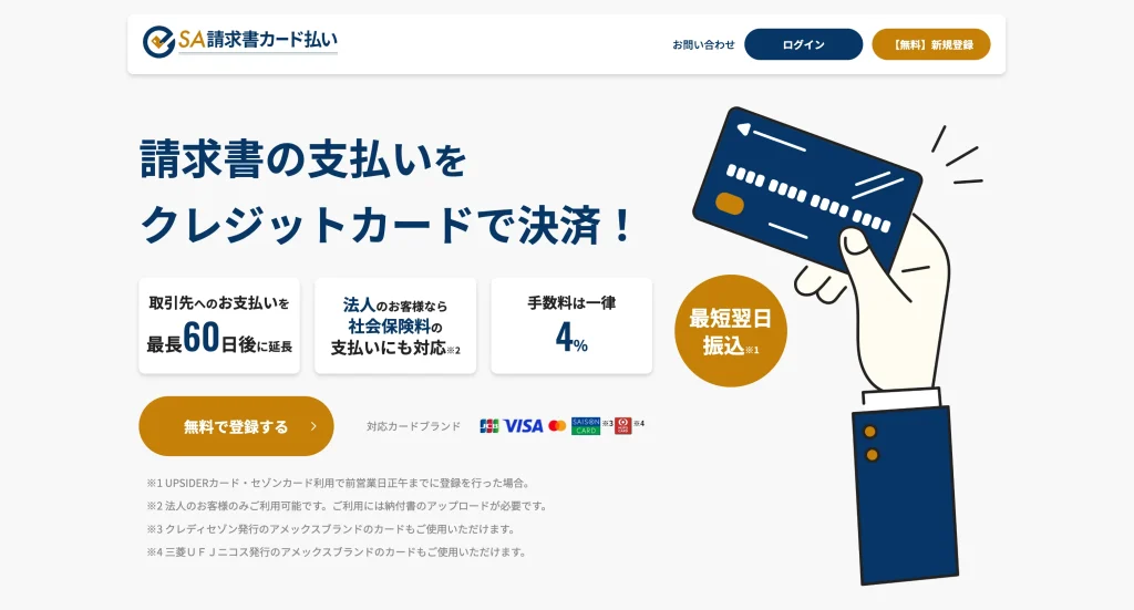 SA請求書カード払い![]() 詳細を見る | 4% 非課税 | (VISA) (Mastercard) (JCB) (SAISON CARD) (MUFG CARD) | 法人・個人事業主 対応スピード 最短翌日 100万円利用の手数料 40,000円(非課税) |